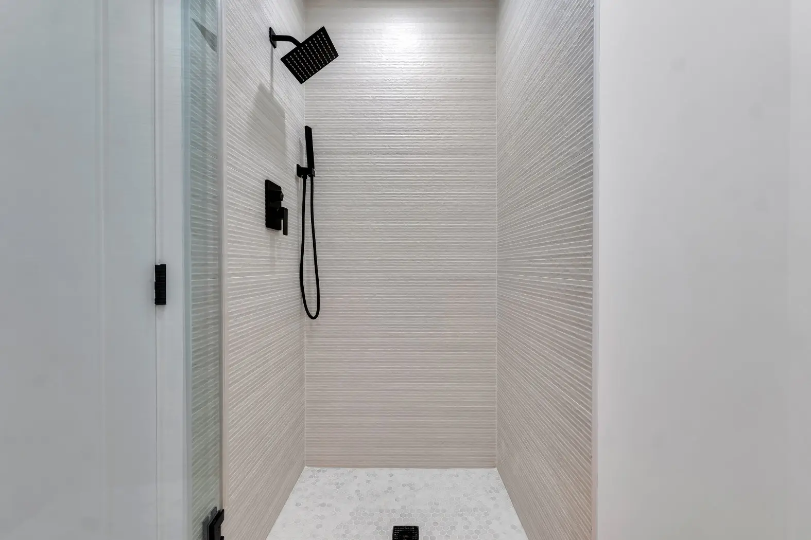Sleek, spacious showers with rainfall and handheld fixtures.