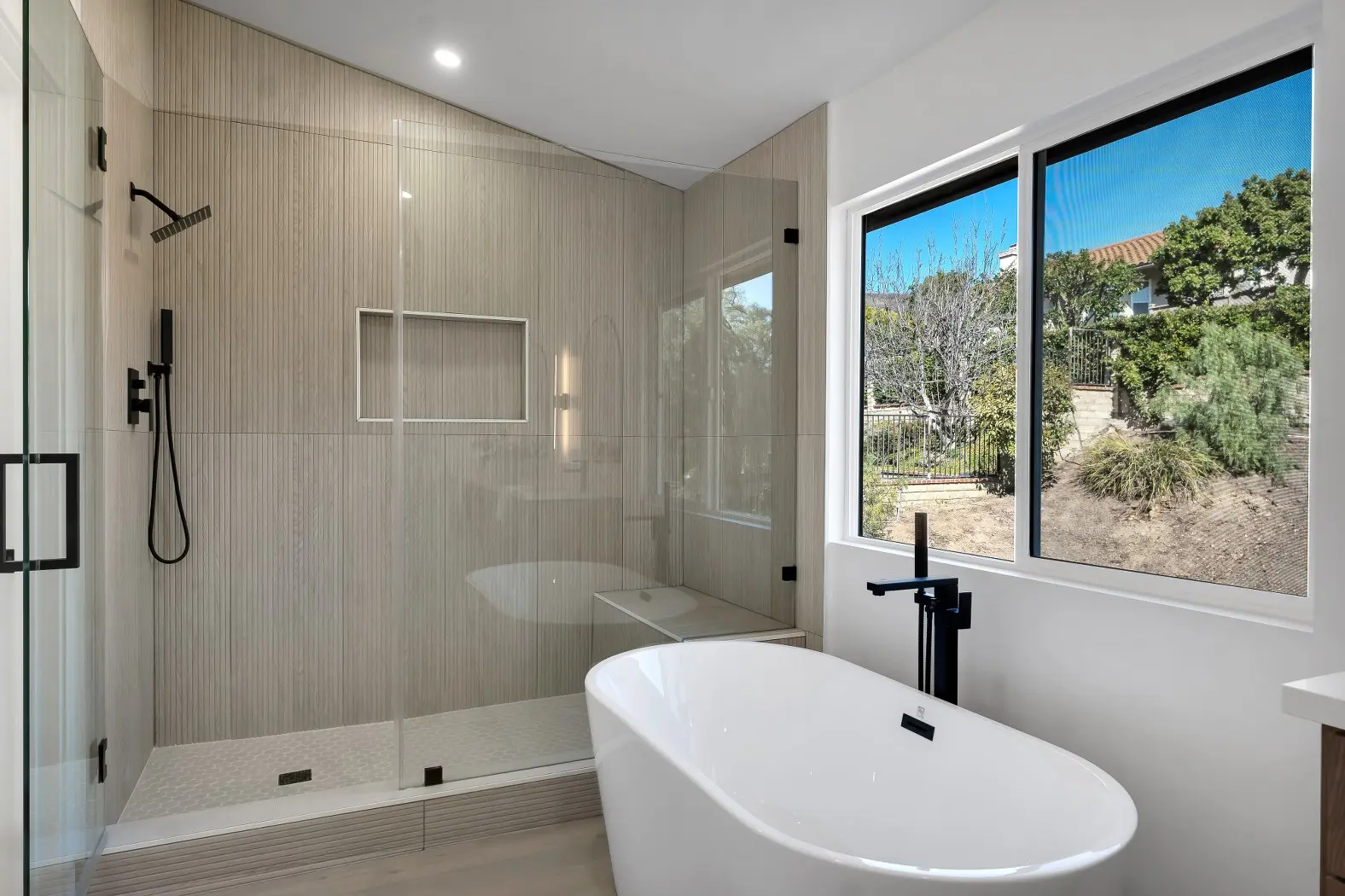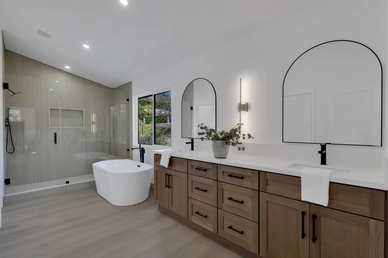 Freestanding tub, dual vanities, and modern tile finishes for a luxury feel.