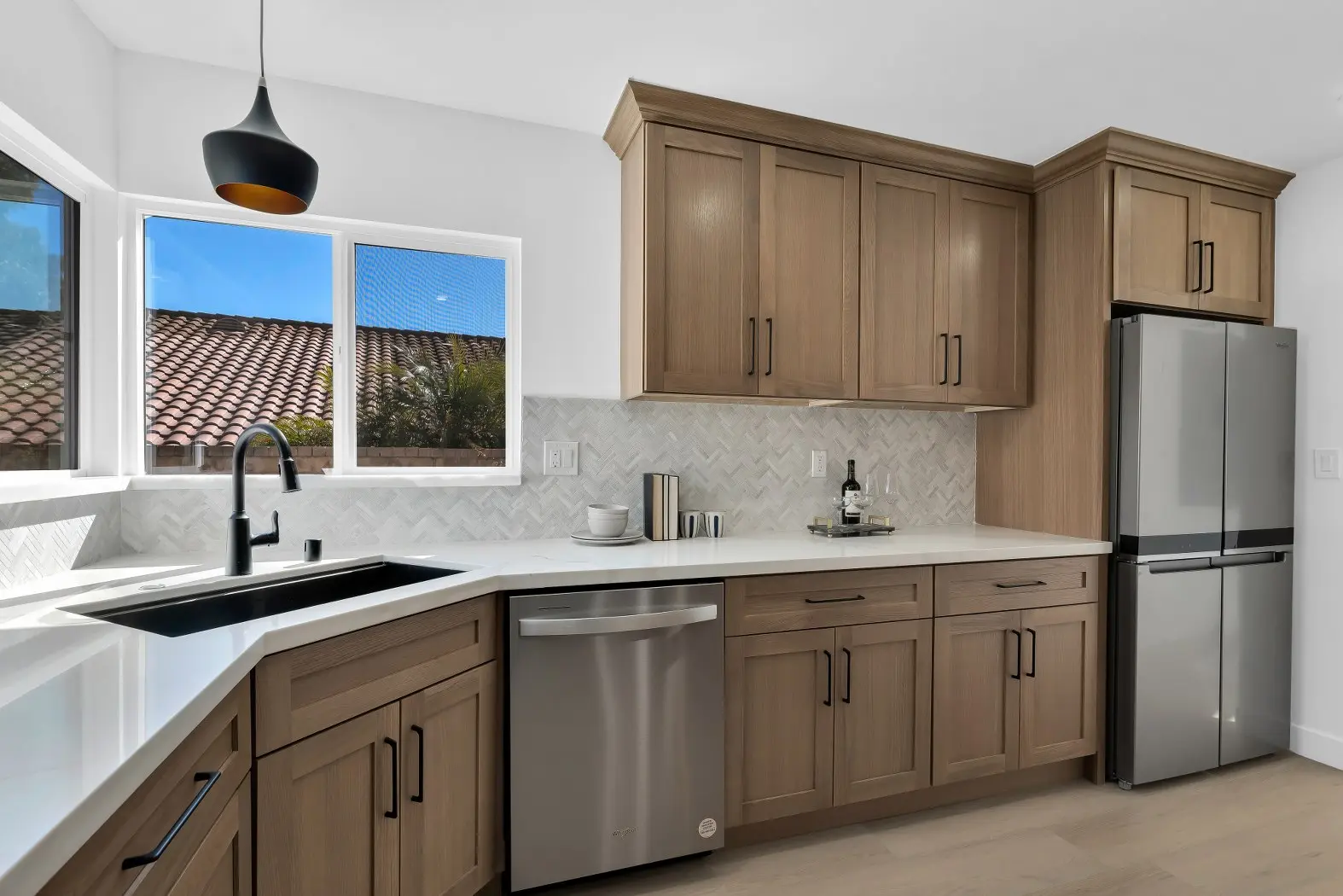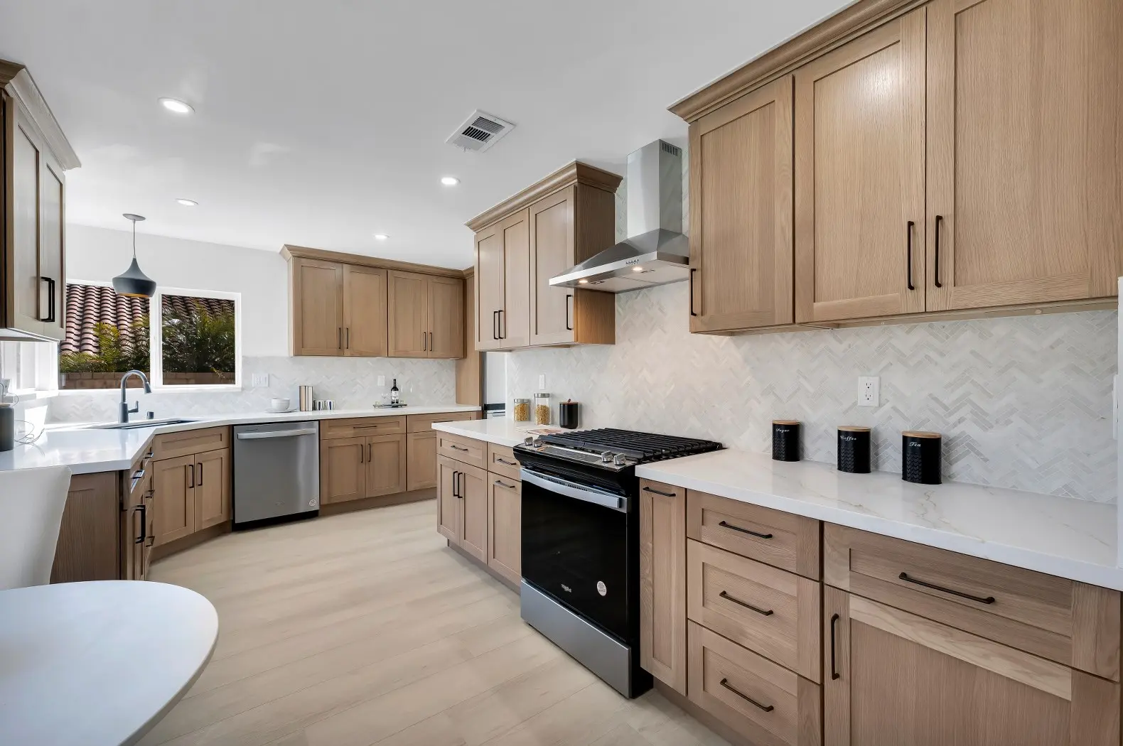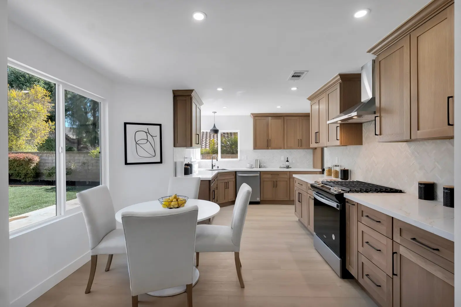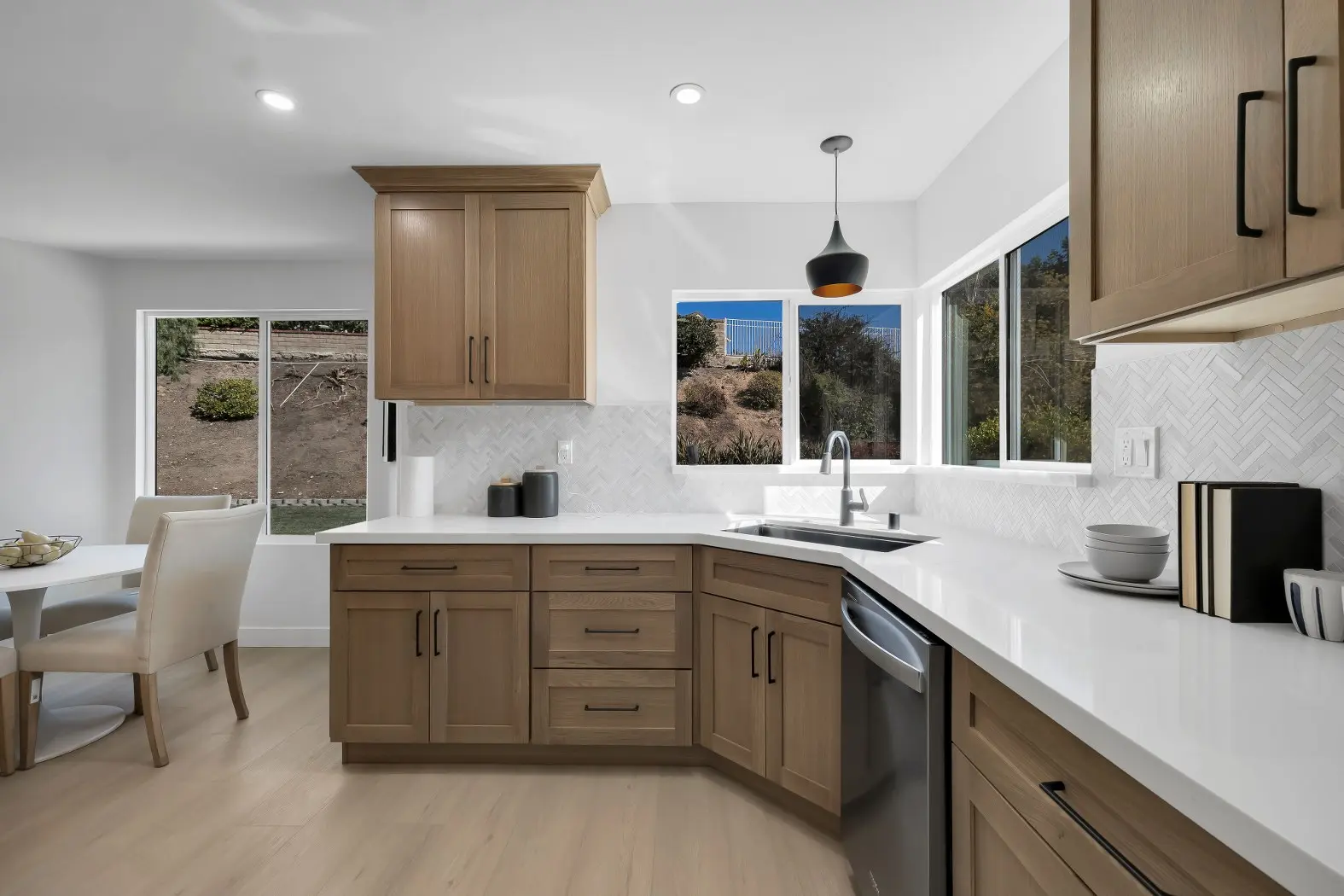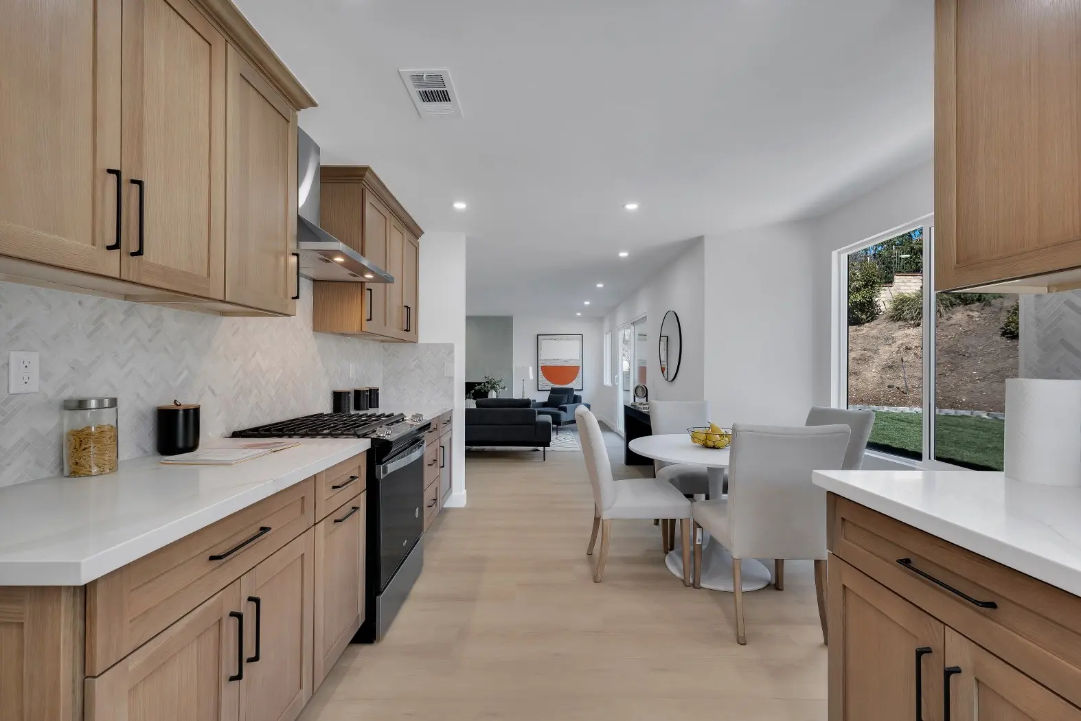 This Los Angeles Kensington remodel combines refined craftsmanship with a clean, contemporary aesthetic, delivering a luxurious yet welcoming home environment. The renovation focused on both form and function, with the kitchen, dining, and bathrooms receiving high-end upgrades to match modern lifestyles. Warm wood cabinetry, natural stone accents, and sleek black fixtures are balanced with bright, airy spaces to create a timeless interior that feels both stylish and comfortable.