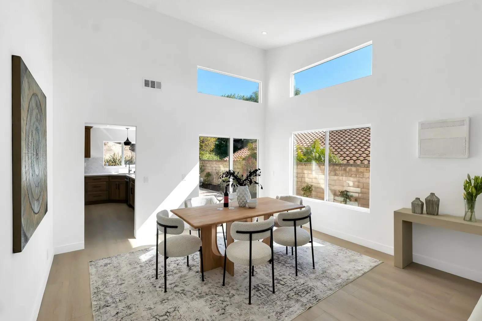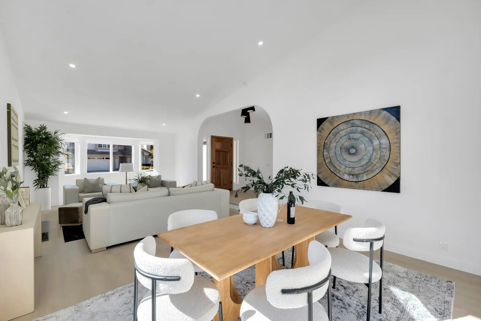 Seamless flow between kitchen, dining, and living areas.